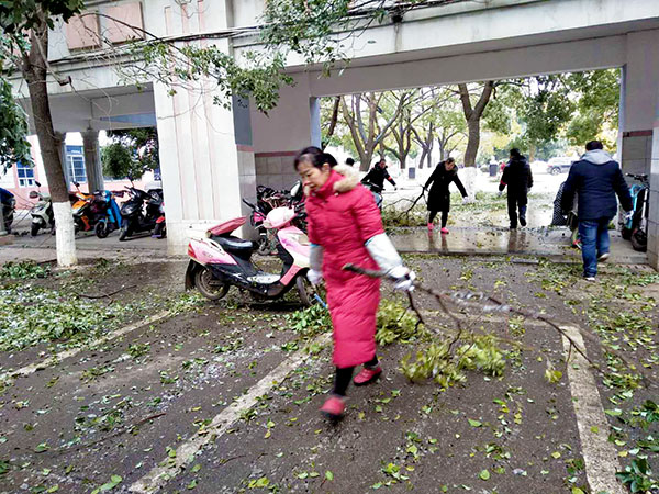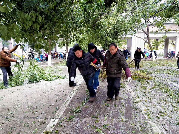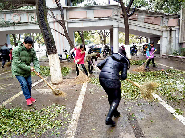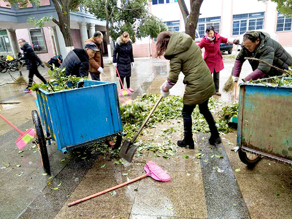 今年的冬天,南昌遇上十年不遇的极寒天气,寒风刺骨、道路结冰、树挂冰凌,大批树木枝丫折断,掉在路面,给师生出行带来了诸多不便。29日一早,为了不影响学校的教育教学,教职员工在杨校长的统一部署下,大家拿起铁锹、扫帚迅速展开清雪、除枝的劳动。