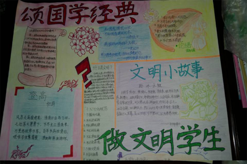 通过这期手抄报的制作,学生们在选材、制作、欣赏的过程中再次受到了国学古训的熏陶,开拓了视野、陶冶了情操,也让学生再一次感悟到国学经典的魅力之处,同时也让学生真正参与到学经典、用经典的实践中去。