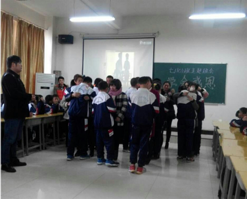 在感恩父母的环节中,主持人展示一系列关于自己父母的问题向同学们提问,考查同学们对自己父母的了解程度。紧接着播放视频《人的一生,感恩教育》 ,短片中浮现出我们从小到长大成人及父母从年轻到年迈各阶段的特征,旨在培养学生的感恩之心。视频过后,展示的是一名叫章钰同学写给爷爷奶奶的一封信。章钰三岁时,父母就分开了,爷爷奶奶抚养了章钰整整十年。在这十年间,爷爷奶奶承担了太多本该章钰父母承担的责任。寒冬里,他们起早床,为孙女准备早餐,洗衣服。晚上,悉心为孙女盖被子。十年间,章钰在慢慢长大,爷爷奶奶却在慢慢变老。借此机会,章钰同学利用攒下的零花钱,为爷爷奶奶献上了一份真挚的礼物,感谢他们的养育之恩。此时,《时间都去哪了》从耳边传来,三人相拥而泣。情到深处,感人肺腑,全场为之动容,在座的校长、老师、家长、同学们都流下感动的泪水。借着章钰同学对爷爷奶奶的深情倾诉,主题班会来到了此环节的后一部分,部分同学给父母献礼,同学们纷纷感激父母的养育之恩,对自己的不懂事表示深深的愧疚。